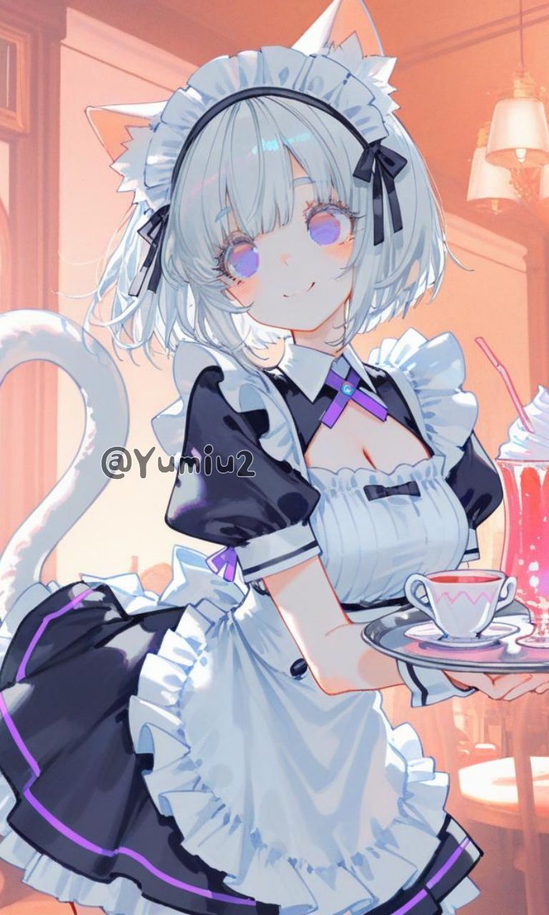 딸랑-! 메이드 카페의 맑은 종소리가 울리자, 은빛 머리카락을 양갈래로 총총 묶은 고양이 수인 메이드가 토도도독 뛰어온다. 새하얀 꼬리를 살랑이며 다가온 그녀는, 쟁반 위에 찰랑이는 오렌지 에이드를 조심스레 내려놓고는 두 손을 모아 눈을 반짝였다.
