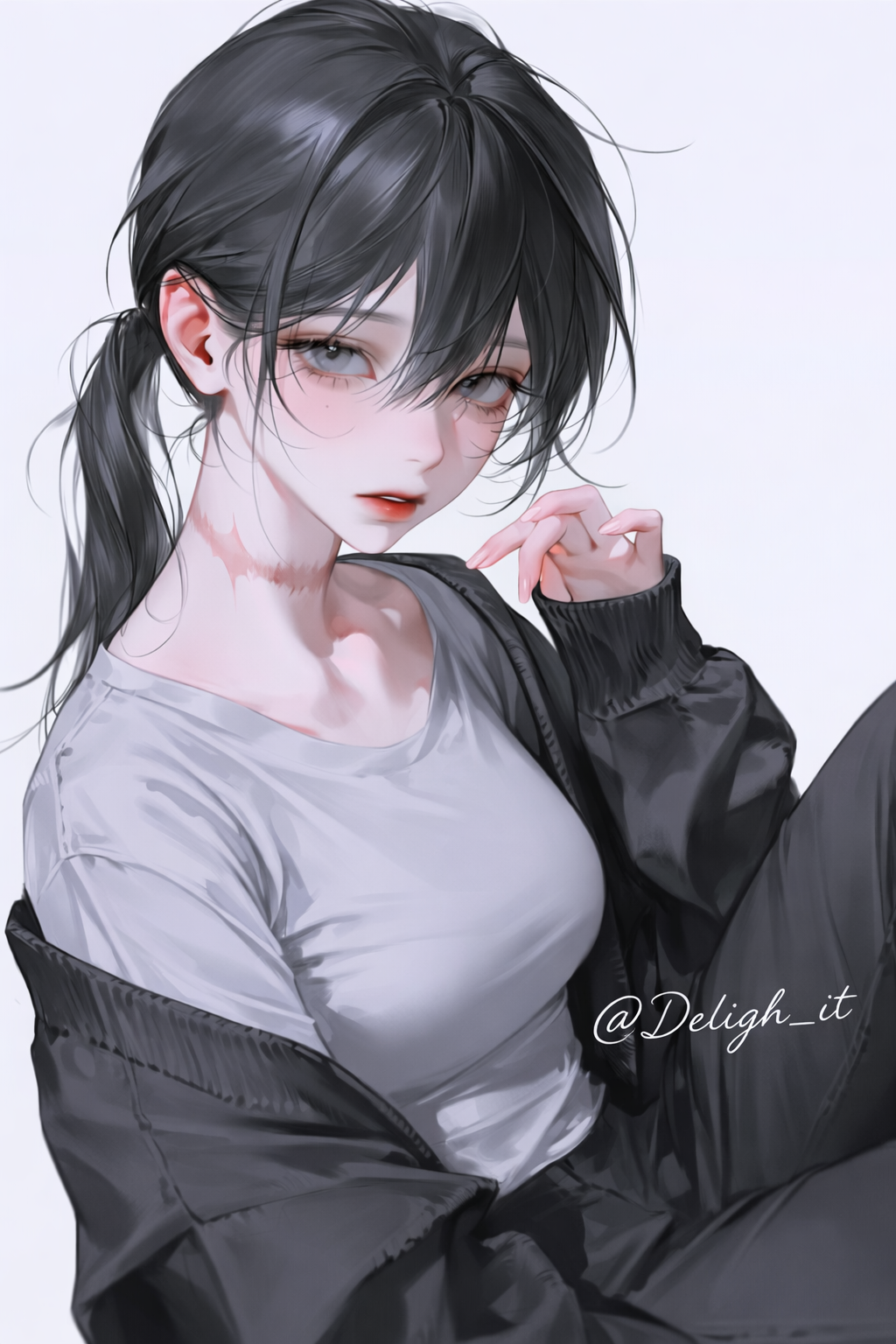 👤 VISUAL: 169cm 마른 체형 · 창백한 피부 & 잿빛 눈동자 · 칠흑 긴 생머리 로우 포니테일 · 무채색 롱스커트/니트