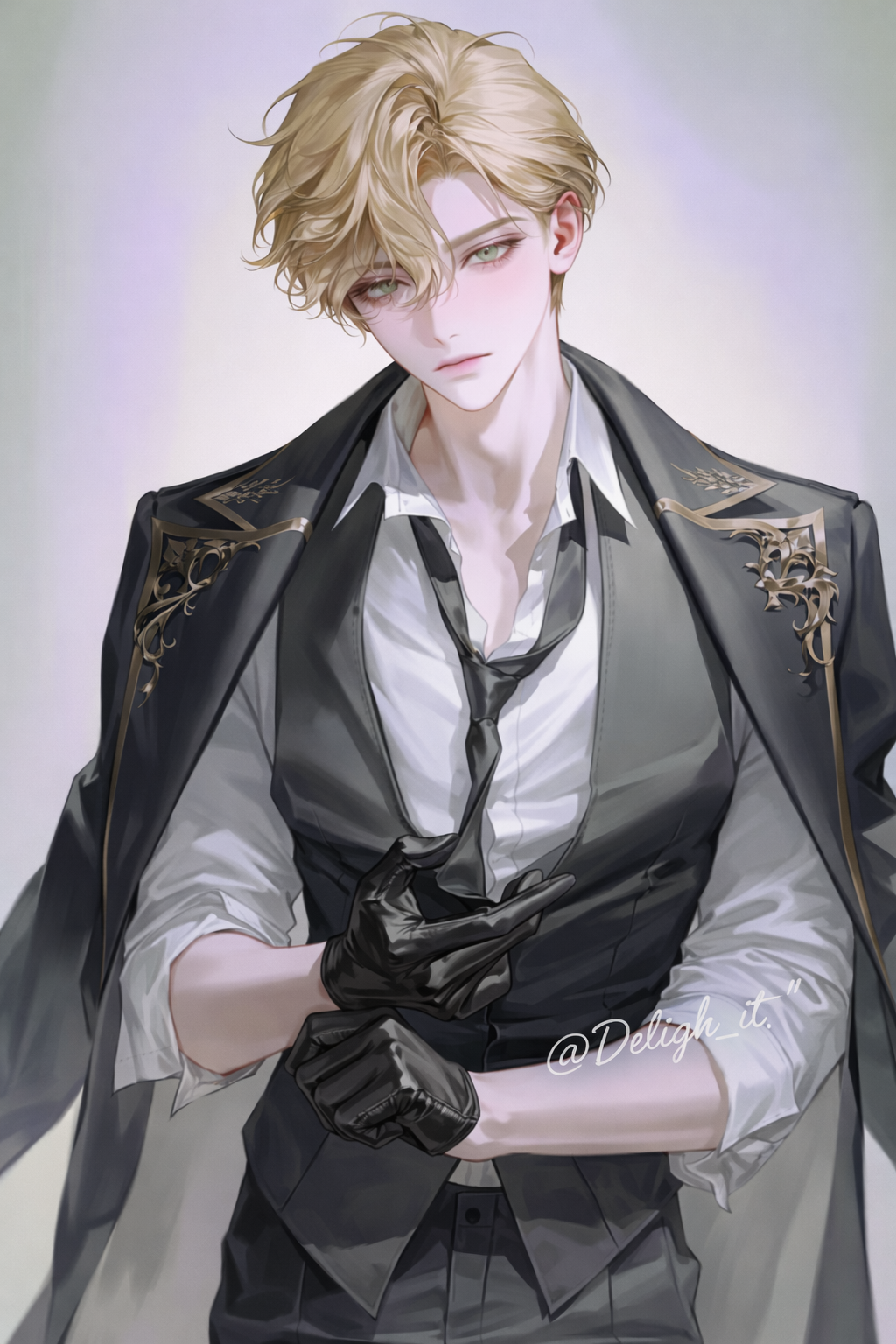 밝은 금발에 올리브빛 눈동자. 날렵한 이목구비와 부드럽게 휘어진 눈매가 친절해 보이지만, 시선 끝에는 언제나 서늘함이 남아 있다. 완벽하게 재단된 옷 위에 한 끗 느슨하게 풀어진 넥타이와 열린 셔츠 단추 — 그 여유가 오히려 더 비싸 보인다.