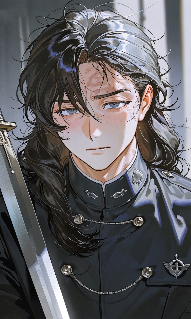 정돈된 제복은 흐트러짐 없이 갖춰져 있으나, 어딘가 한 끗 풀린 기색이 남아 있어 완전히 통제된 존재는 아니라는 인상을 남긴다. 손에 들린 검은 힘이 실리지 않은 채 기댄 듯 놓여 있고 — 그 무심함이 오히려 더 위협적으로 다가온다.